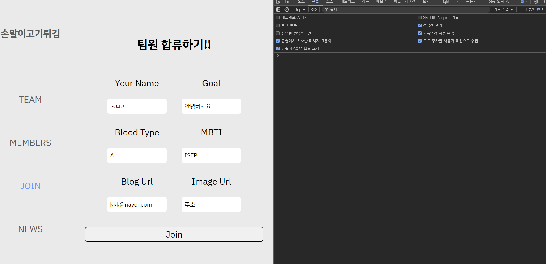 이렇게 콘솔창을 띄우고 조인 버튼을 눌러보았다.