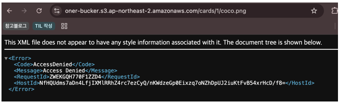 TODO.1 카드의 Attachment기능 부분을 구현함에 있어 파일을 aws의 버킷에 저장을 하여 URL주소를 받아오는 것 까지는 잘 수행되었으나 해당 URL로 접속을 하여도 이미지가 보이지 않고 ACCESS DENIED가 발생하는것을 발견